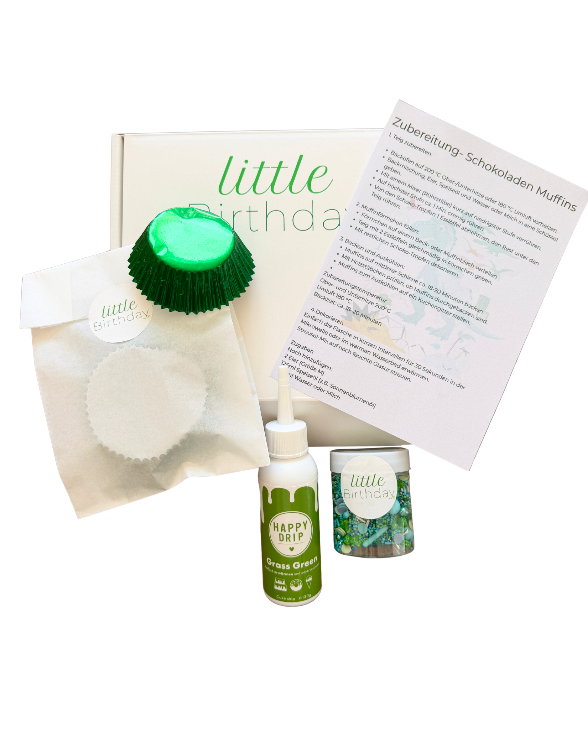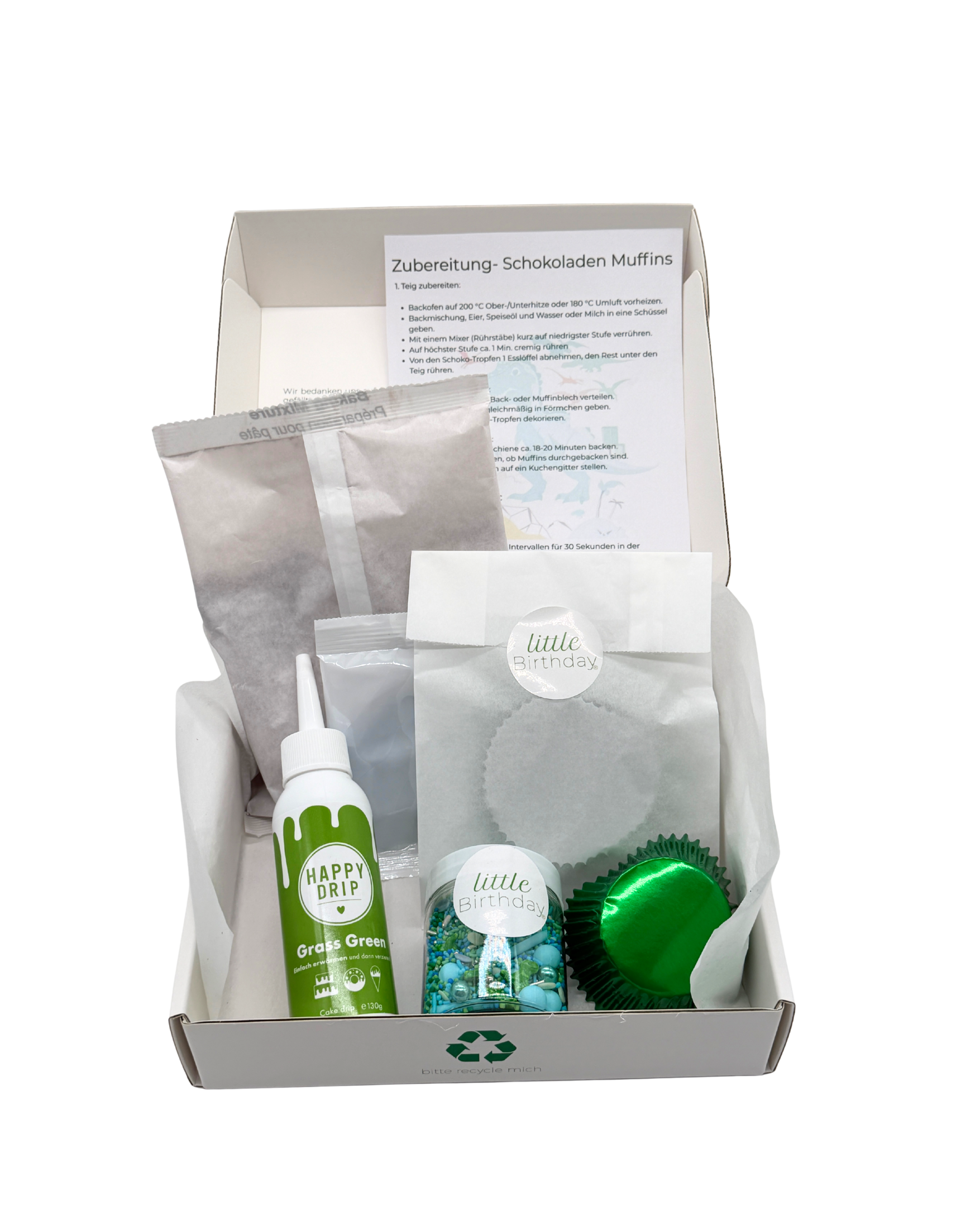 Die Back Box Dino von little Birthday bringt Abenteuer in den Ofen. Mit coolen Dino-Streuseln, schokoladigem Drip, 12 Muffinförmchen im Dinosaurier-Design und einer leckeren Backmischung entstehen im Handumdrehen urzeitlich gute Muffins – perfekt für kleine Entdecker.